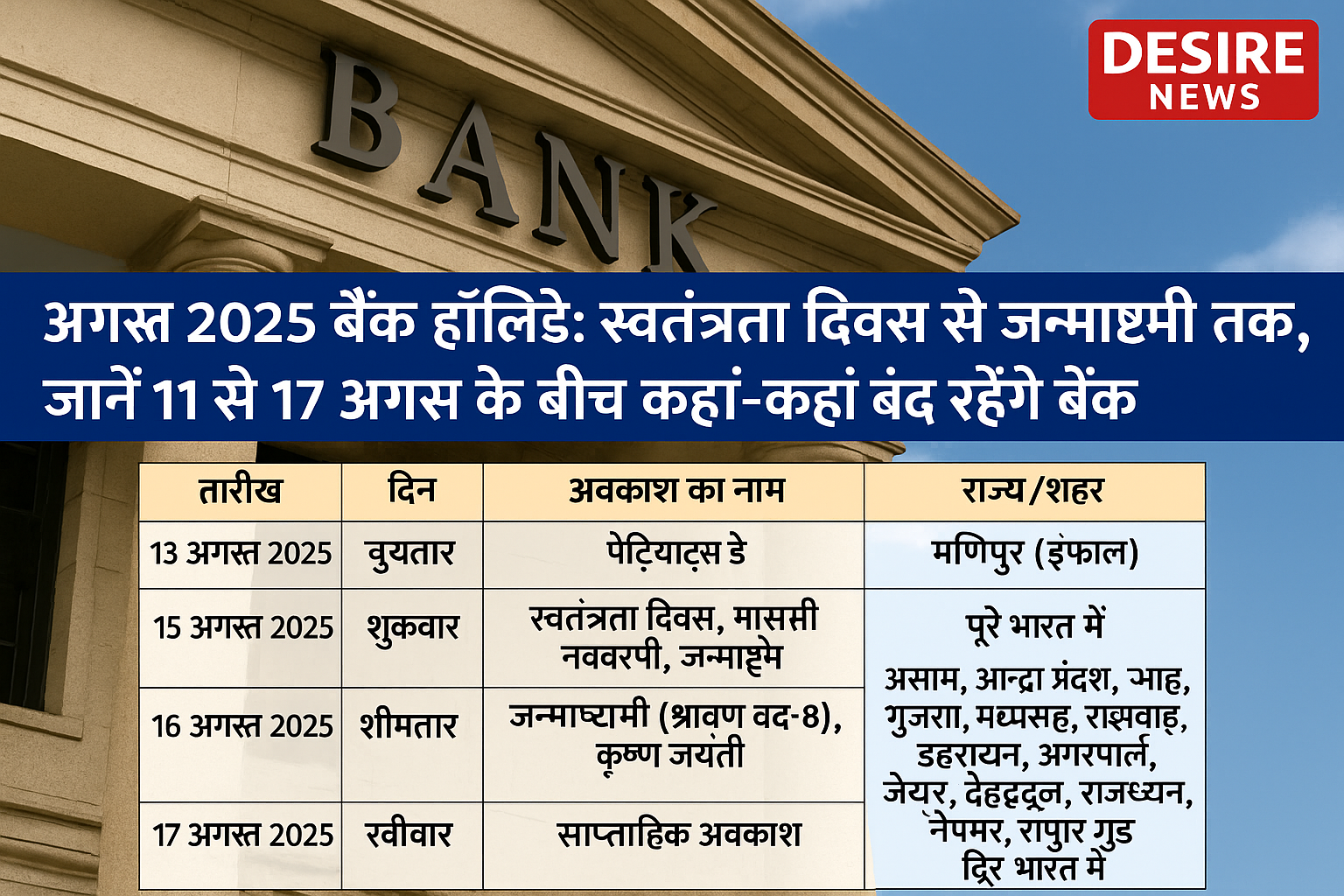 अगस्त 2025 बैंक हॉलिडे: स्वतंत्रता दिवस से जन्माष्टमी तक, जानें 11 से 17 अगस्त के बीच कितने दिन बंद रहेंगे बैंक, राज्यवार पूरी लिस्ट